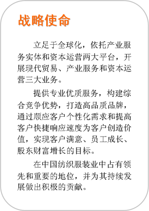 產業服務業是紡織工貿集團在未來五年中加速發展的戰略業務,該板塊主要是圍繞著集團紡織服裝這一主業,通過整合集團資源,提升資源使用效率,獲取產業鏈競爭優勢,重點打造廣州T.I.T國際紡織城。