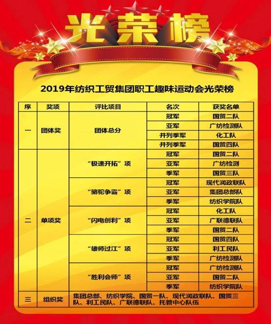 經過緊張激烈的幾輪比拼后,國貿二隊、廣紡檢測隊、廣州化工隊和國貿四隊分別榮獲團體總分冠、亞、季軍(并列);國貿二隊、現代潤政聯隊、廣州化工隊、國貿四隊、廣紡檢測隊等代表隊喜摘5個單項冠軍;集團總部隊等8支隊伍獲得優秀組織獎。(詳細獲獎名單見文末光榮榜)