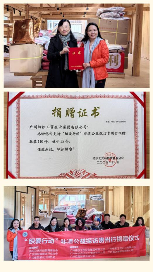 近日,紡織公司黨委副書記丘海瀾一行參加了由紡織之光科技教育基金會、中國婦女發展基金會主辦,中國服裝協會、中國紡織工業企業管理協會、廣東省服裝服飾行業協會、廣東省服裝設計師協會協辦的“織愛行動”非遺公益探訪貴州行活動。今年,紡織公司旗下“利工民汗衫背心制作技藝”成功入選廣州市荔灣區第八批非物質文化遺產代表性項目名錄。此次活動希望通過對非遺手工藝進行深入調研,探討融合發展道路,同時向困境婦女及家庭傳遞溫暖。一方面通過捐款、捐贈紡織服裝物資進行直接幫扶;另一方面通過賦能傳統手工技藝,引導紡織服裝行業品牌企業、設計師與傳統手工技藝融合共益共生發展,讓傳統手工技藝從“指尖技藝”轉變為“指尖經濟”,推進就業創業、助力困境女性可持續發展,體現了企業的社會責任感和文化傳承的使命。