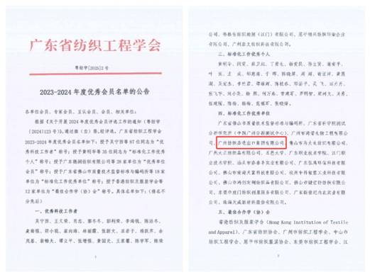 廣州紡織品進(jìn)出口集團(tuán)有限公司(以下簡稱“紡出公司”)在2024年廣東省紡織工程學(xué)會(huì)開展的2023-2024年度優(yōu)秀會(huì)員評(píng)選活動(dòng)中,榮獲“標(biāo)準(zhǔn)化工作優(yōu)秀單位”稱號(hào)。關(guān)勇獲評(píng)為“標(biāo)準(zhǔn)化工作優(yōu)秀個(gè)人”,張菁、陳繼成、孫立大和高新武獲評(píng)為“優(yōu)秀科技工作者”。這一榮譽(yù)是對(duì)公司團(tuán)隊(duì)專業(yè)能力和敬業(yè)精神的高度贊揚(yáng),也是激勵(lì)每一位員工繼續(xù)秉承匠心精神,不斷探索與實(shí)踐,為紡織行業(yè)的進(jìn)步貢獻(xiàn)更多力量的巨大動(dòng)力。