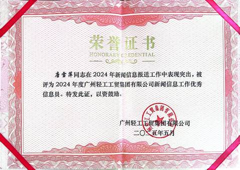 5月8日,廣州輕工集團2025年新聞信息工作會議對2024年度新聞信息工作先進單位和先進個人進行了表彰。紡織公司榮獲“2024年度廣州輕工工貿集團有限公司新聞信息工作先進單位”稱號,唐雪萍、常陽被評為“2024年度廣州輕工工貿集團有限公司新聞信息工作優秀信息員”。