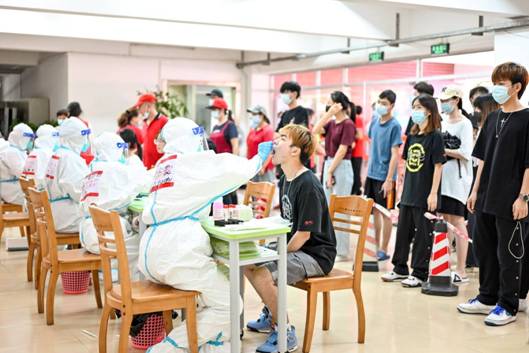 排隊、錄入信息、咽拭子采樣,在集中采樣點,師生員工全程佩戴口罩,自覺間隔一米,按10人一組分批分次有序前往采樣區,開設10條通道,在現場醫護人員的引導下,有序進行核酸檢測的采樣。