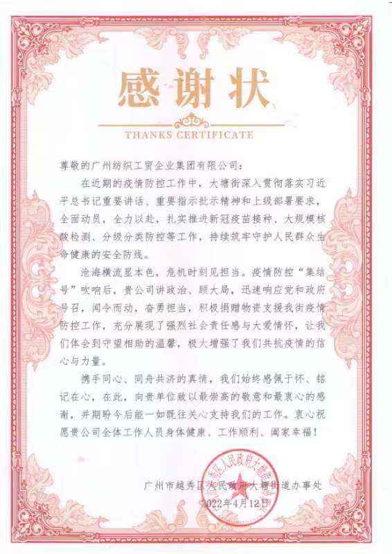 當前,廣州疫情趨緊,4月12日,紡織公司黨委書記、董事長簡瑋儀,黨委副書記、紀委書記、工會主席丘海瀾親自帶隊,把1500盒利工民毛巾送到了越秀區(qū)大塘街道。