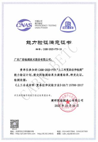 近日,廣東廣紡檢測技術股份有限公司(以下簡稱“廣紡檢測”)參加建研院檢測中心有限公司組織的土工合成材料領域能力驗證項目,獲得能力驗證滿意證書。